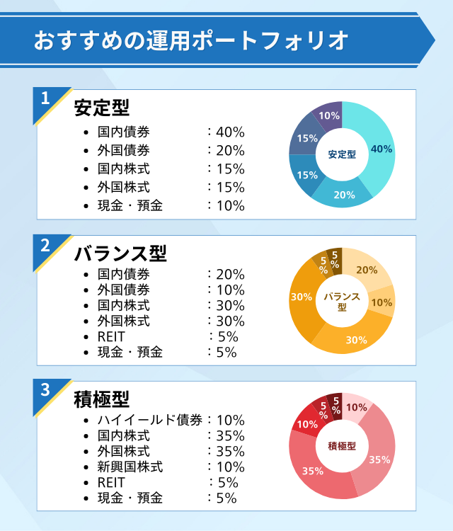 では、どのようなポートフォリオを組めば良いのだろうか。ここでは、おすすめのポートフォリオを3つ紹介する。