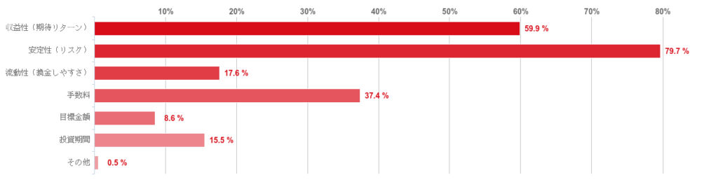 最も多いのが「安定性」と答えた人で、全体の79.7%を占める結果となった。老後資金に向けて資産運用に取り組むなかで、「安定しながら運用できる」という点は安心感にもつながる。