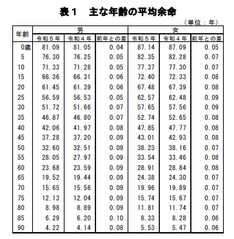 厚生労働省の「令和5年簡易生命表」によると、男性の平均寿命は81.09歳、女性の平均寿命は87.14歳となる。