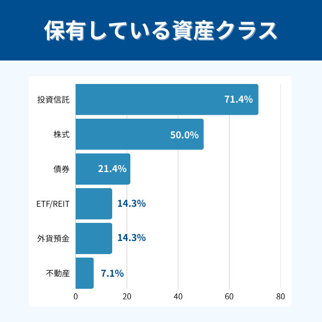 次に、株式や債券といった伝統的金融資産の保有率が高く、ETFやREIT、外貨預金、不動産などで運用している人も少数いた。