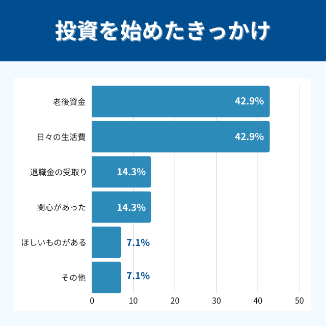 他の年代で回答されていた「子供の教育費のため」「新NISAが始まったから」「SNSやYouTubeを見て興味を持ったから」といった回答はなかった。