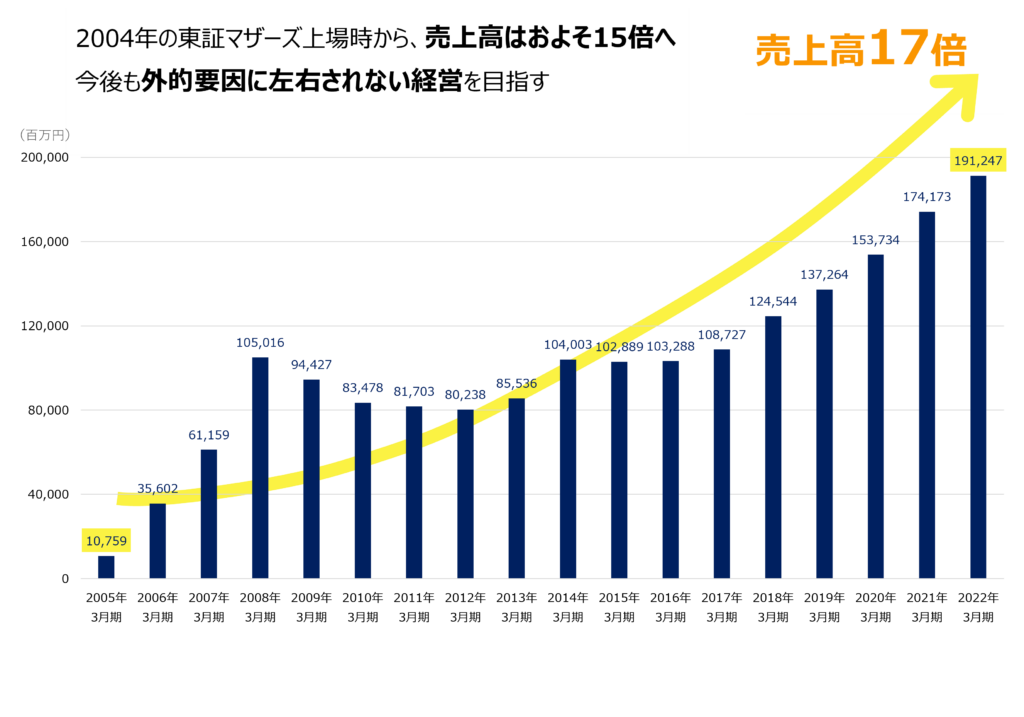 グループ一同で共通のビジョンをもって事業に取り組んだことが功を奏し、6年で売上を2倍、営業利益を3倍、時価総額では5倍にまで成長させることができました。