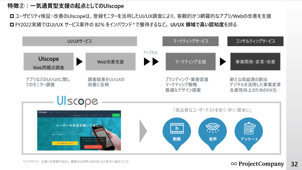 「UIscope」で開拓したお客様に対して、多方面でのケイパビリティを活かしたプロダクト改善、DXのマーケティング支援、新規事業開発の支援等、クロスセルの提案が可能となっています。