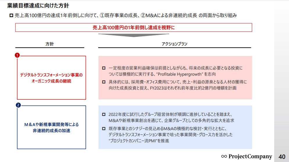 売上高100億円の達成に向け、オーガニックな成長と非連続成長の2本柱で取り組んでまいります。