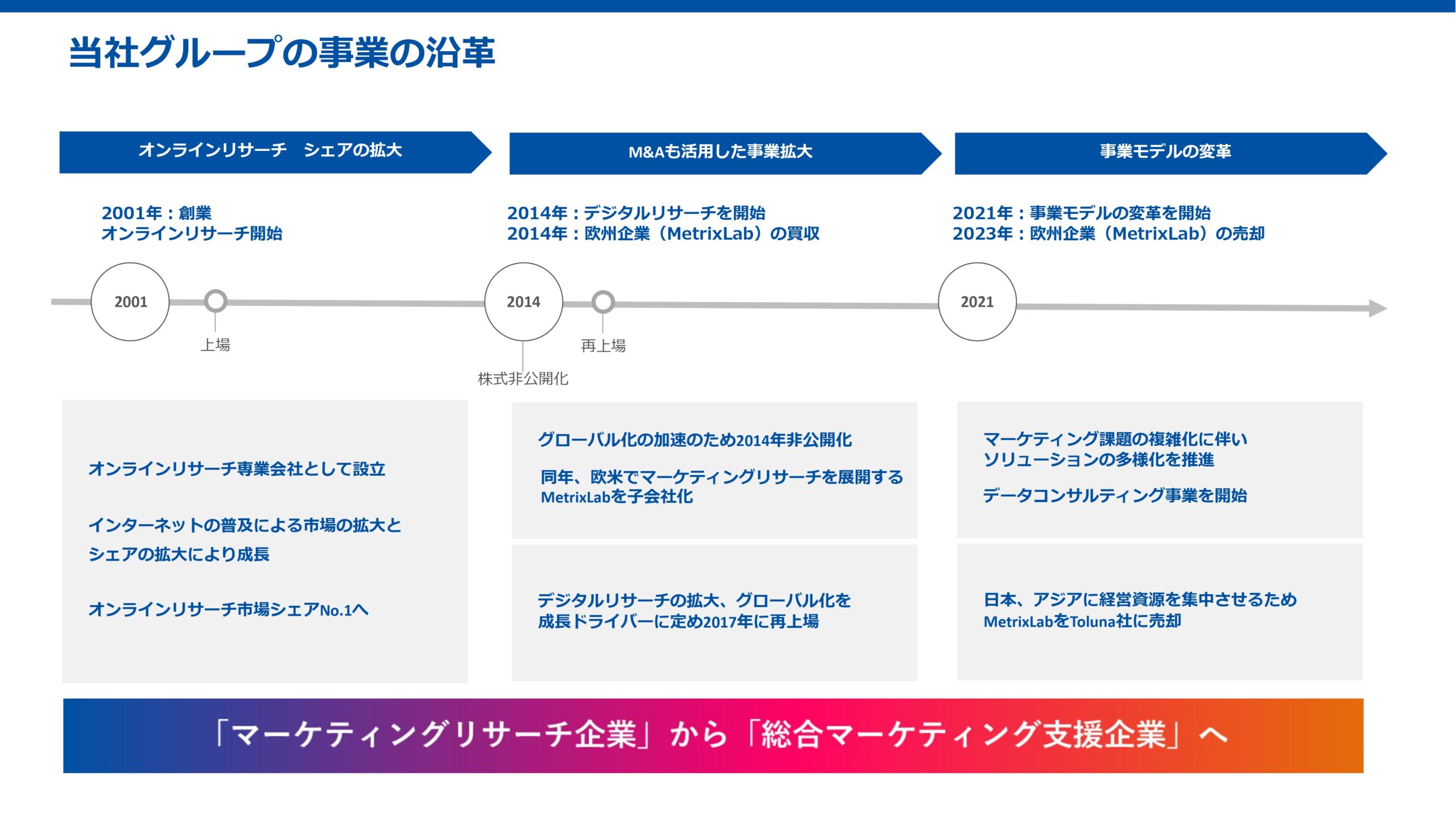 その後、さらにグローバル化を推進するため、2014年に株式を非公開化し欧米でのリサーチを展開していたMetrixLab社を買収するなど、クロスボーダーなM&Aに対しても積極的に投資を行いました。