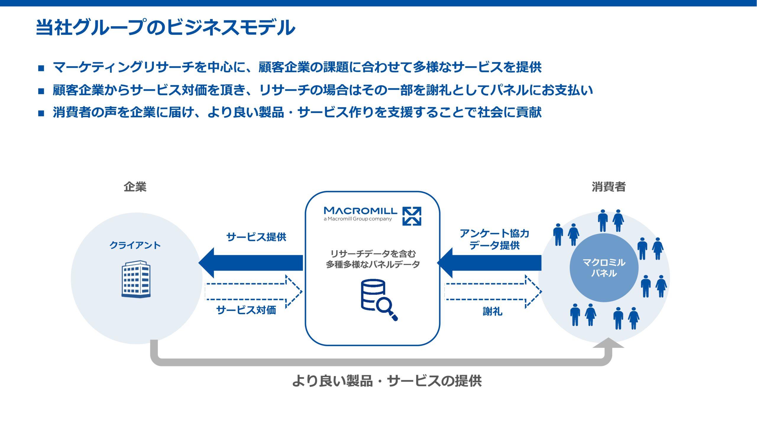 まず一点目は、マクロミルは消費者の日常生活に溶け込んでいる商品やサービスの裏側をサポートしている点です。