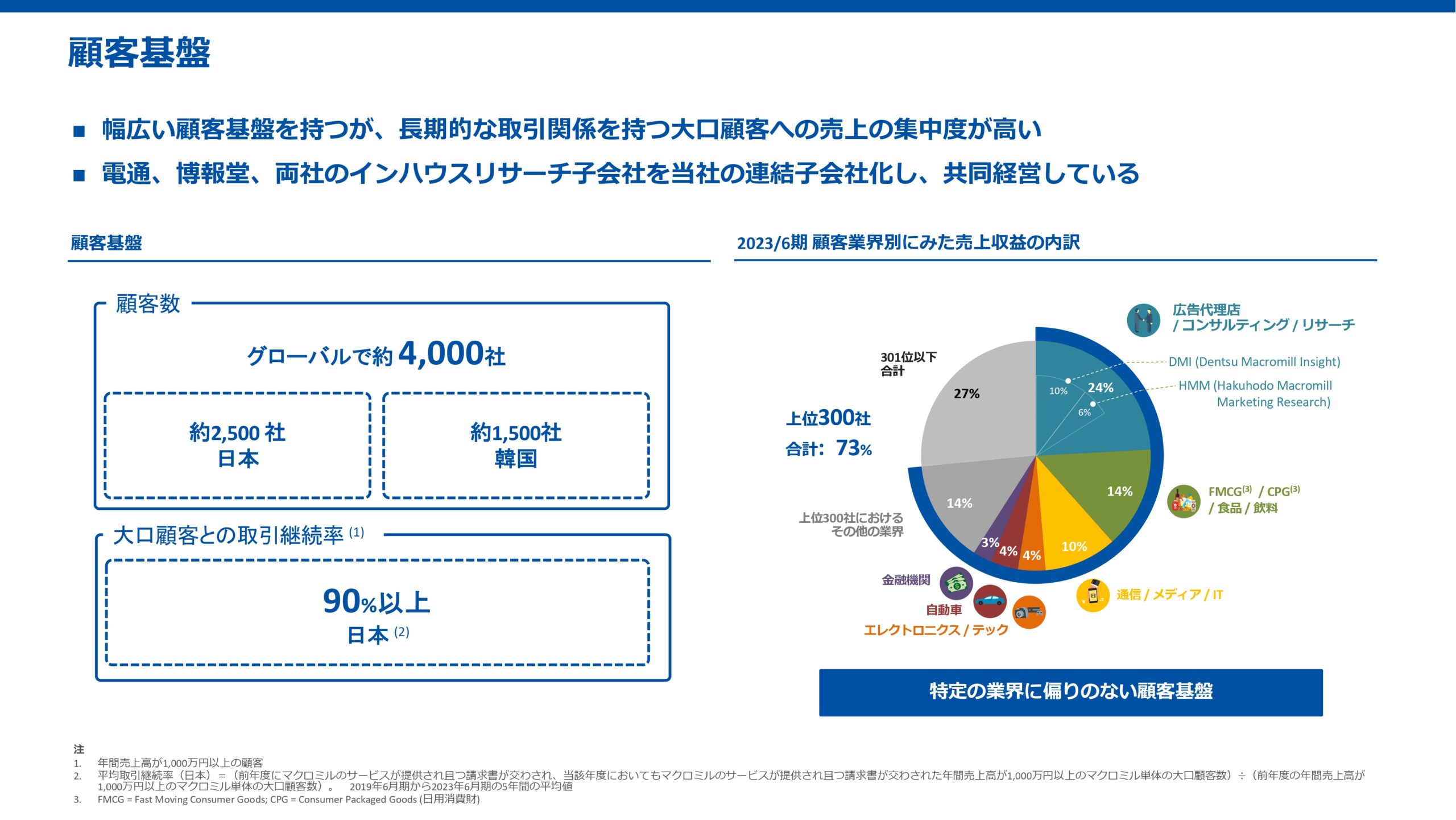 例えば、電通、博報堂などの大手広告代理店やコンサルティングファーム、そして飲料、食品、消費財をはじめ幅広い業界に顧客基盤があります。