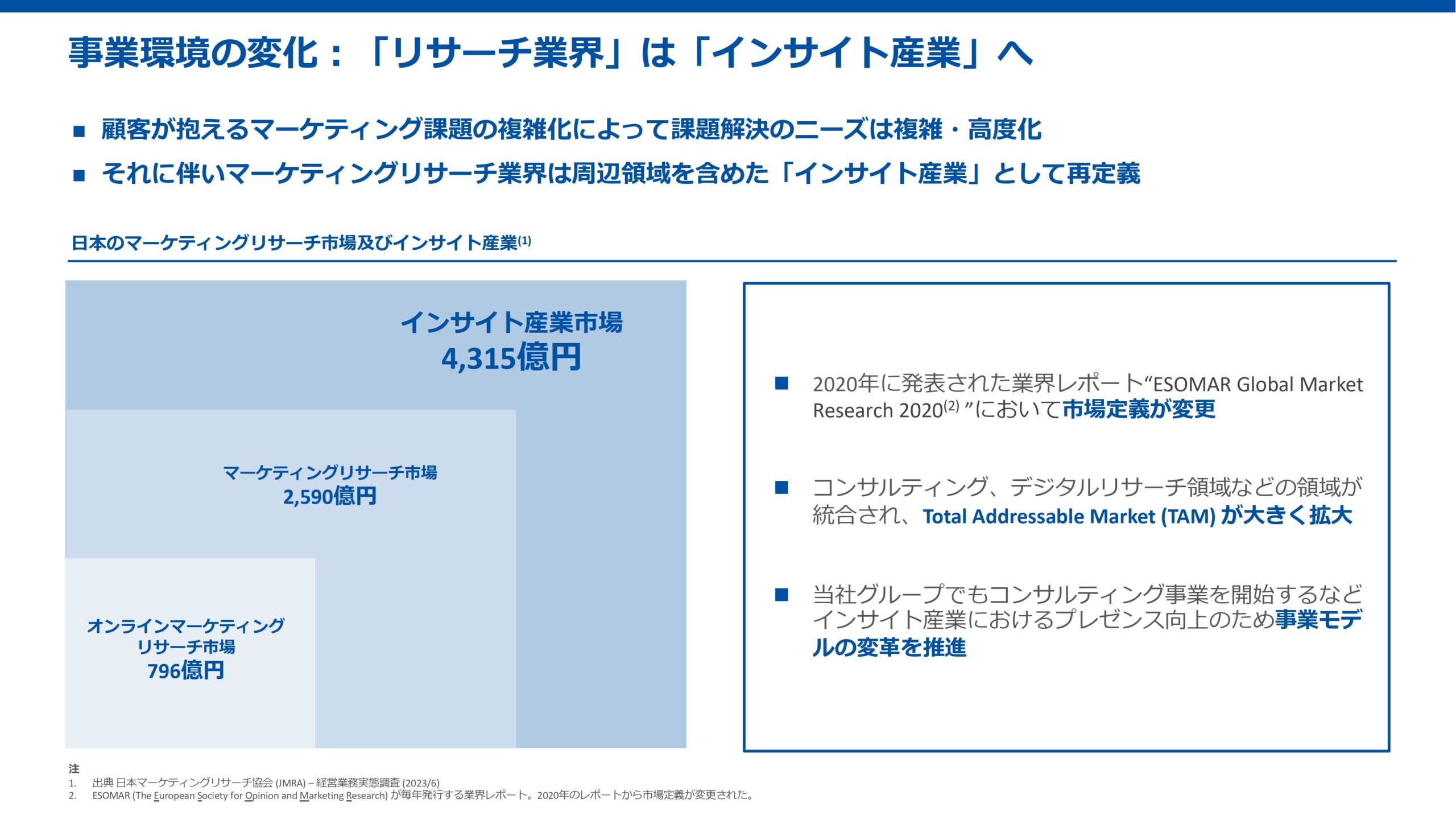 現在、マーケティングリサーチ業界という市場は、周辺領域であるコンサルティング領域、デジタルリサーチ領域などが統合され、インサイト産業と新たに再定義されています。
