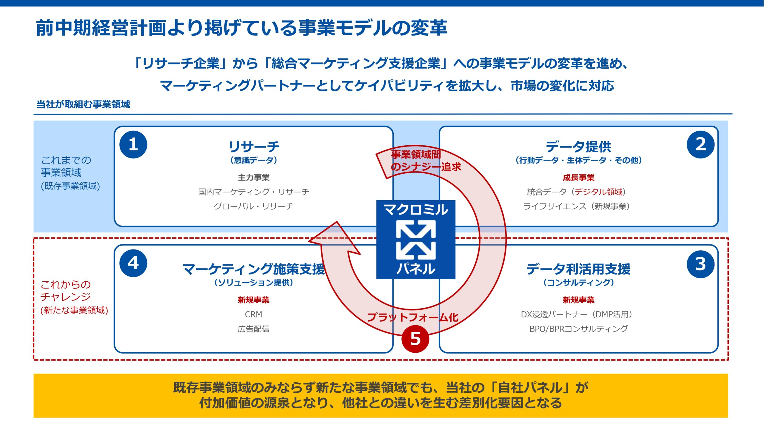 事業モデルの変革を進めることが、今後の成長戦略であり、この点は後ほど詳しくご説明させていただければと思います。(※マクロミルの成長戦略)