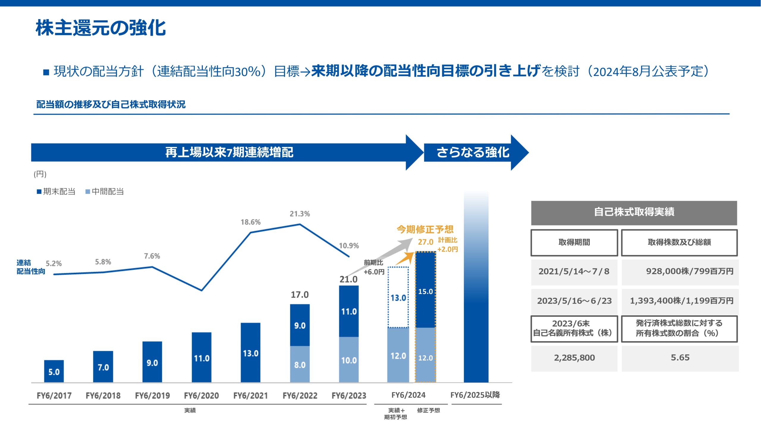 このため、2024年6月期の期末配当は増配修正しており、2024年7月から始まる2025年6月期についてもさらなる株主還元の強化を図る方針です。