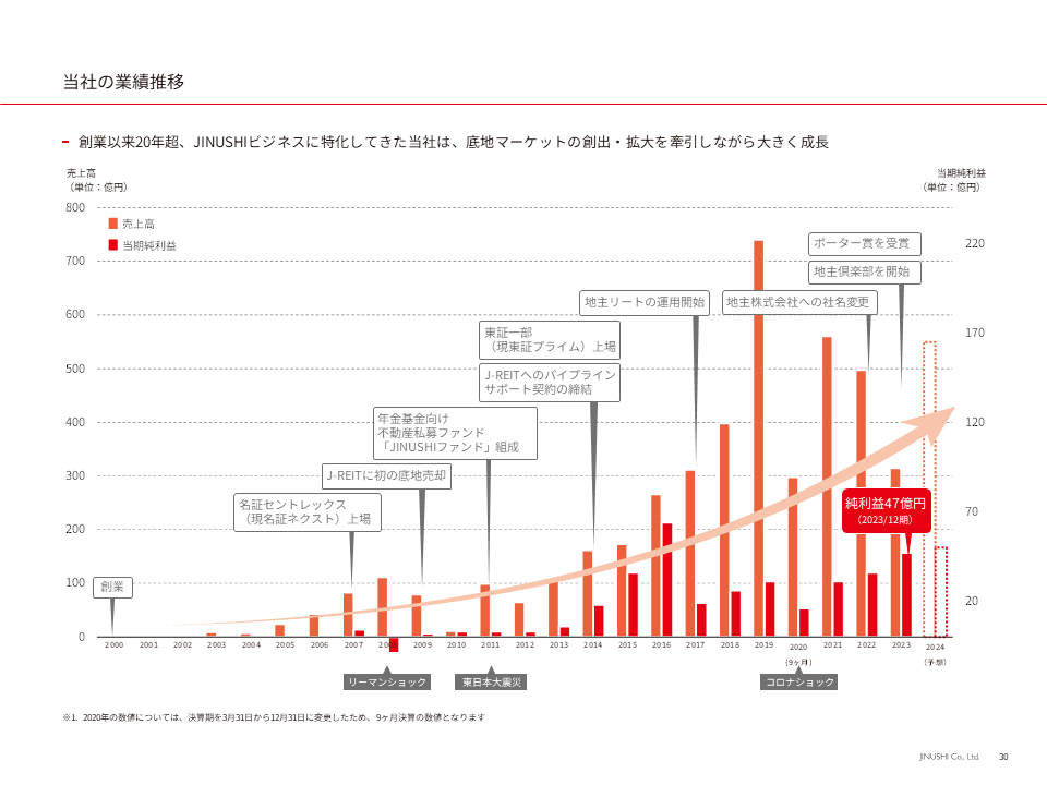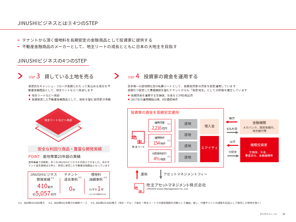 長らく機関投資家から評価いただいてきた、このシンプルなJINUSHIビジネスの長期安定性は、個人の方にもご理解いただけると思います。
