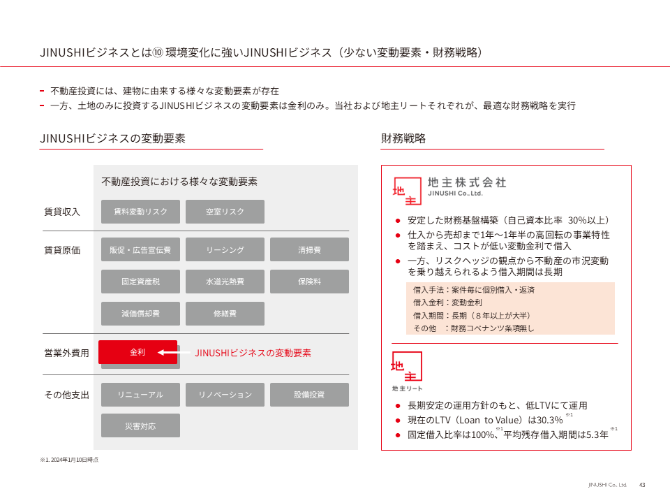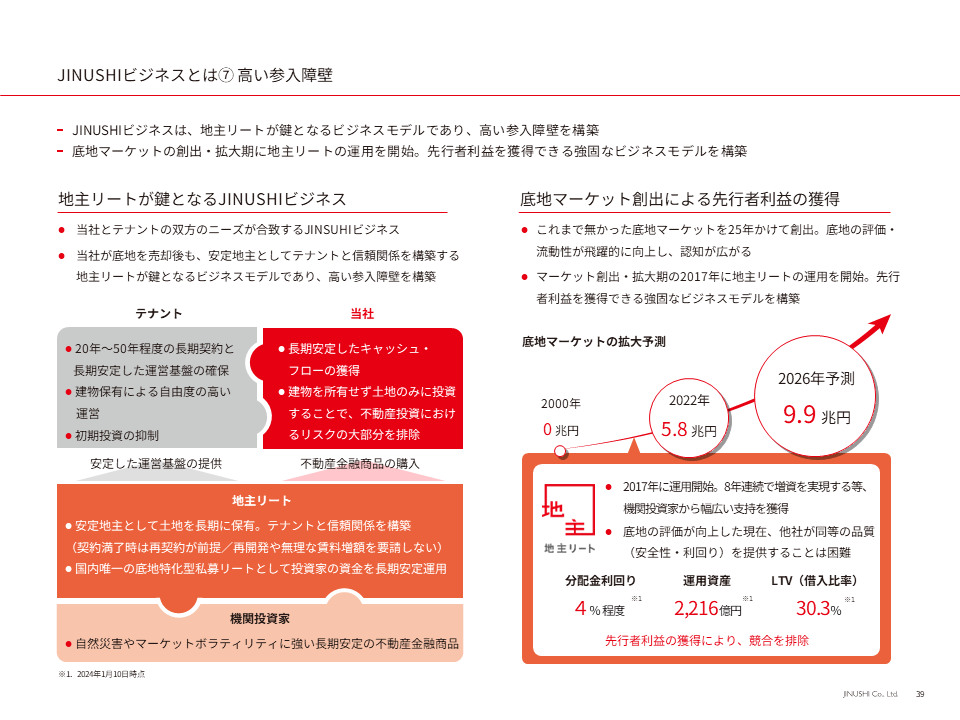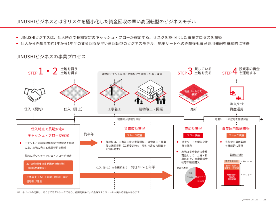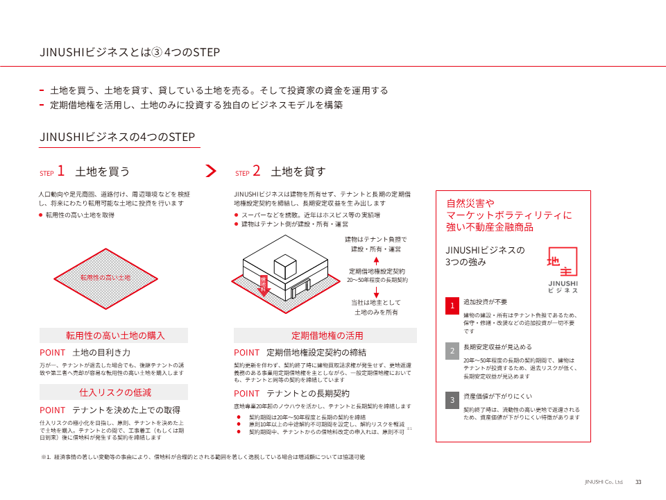 一方で当社のJINUSHIビジネスは、土地の仕入時にテナントと契約を結んでいるので、最初から金融商品として成り立っており、安定した借地料が見込めます。