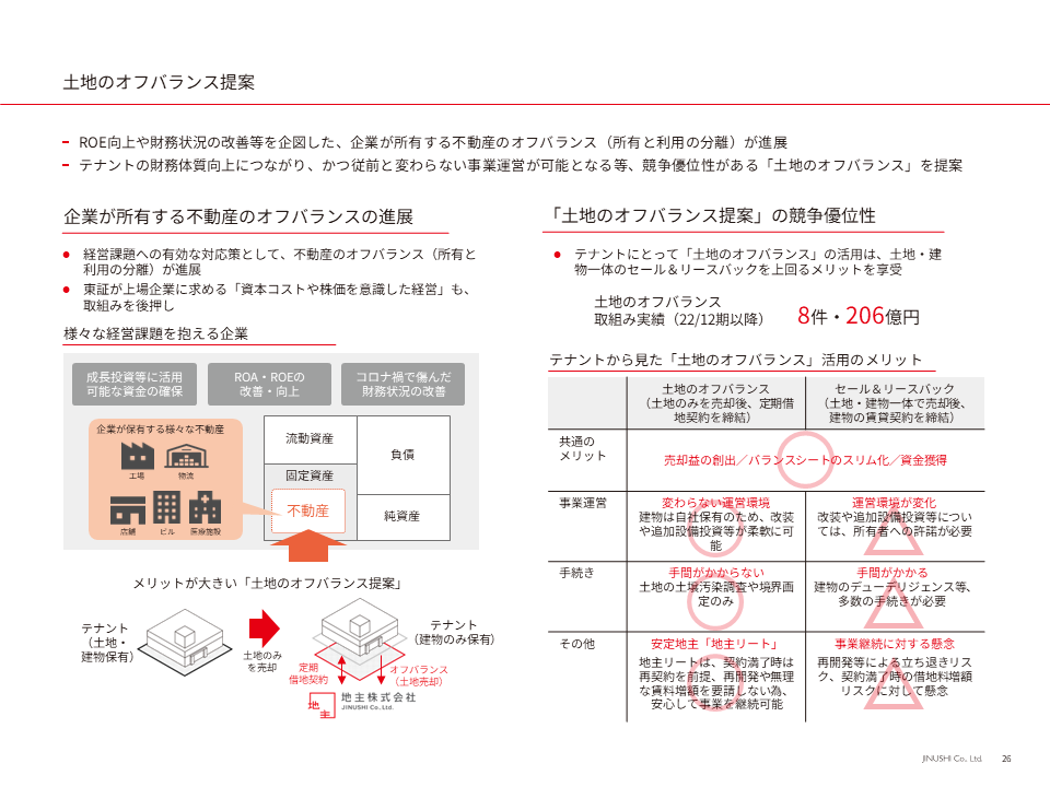 今後も、ニーズを見極めながら、土地のオフバランスの提案を積極的に行っていきます。