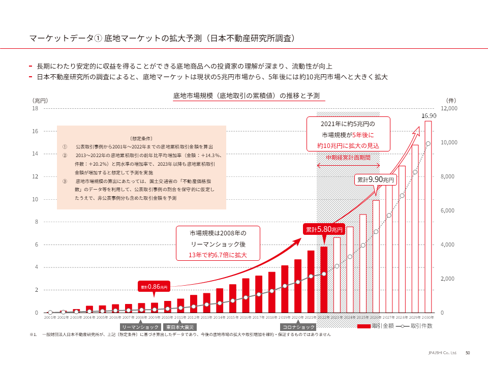 2022年に約5.8兆円だったマーケットは、2026年には9.9兆円にまで成長すると見込まれています。マーケットの創出とともに、底地の評価も向上し、いまでは底地を保有するプレーヤーも増えつつあります。