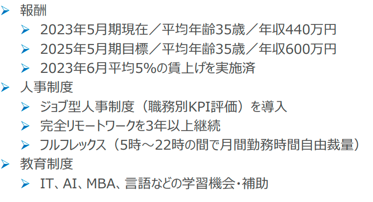 報酬の面では、すでに平均5%の賃上げを行っております。それに加えて今後2年間で平均年収を440万円から600万円に引き上げる取り組みを進めています。