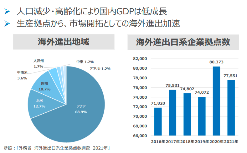 日本のGDPは低下しており、今後も人口減少が続くと考えられています。国内での成長が厳しい中で、海外展開を考えている、もしくは迫られている企業が増えているのが現状です。