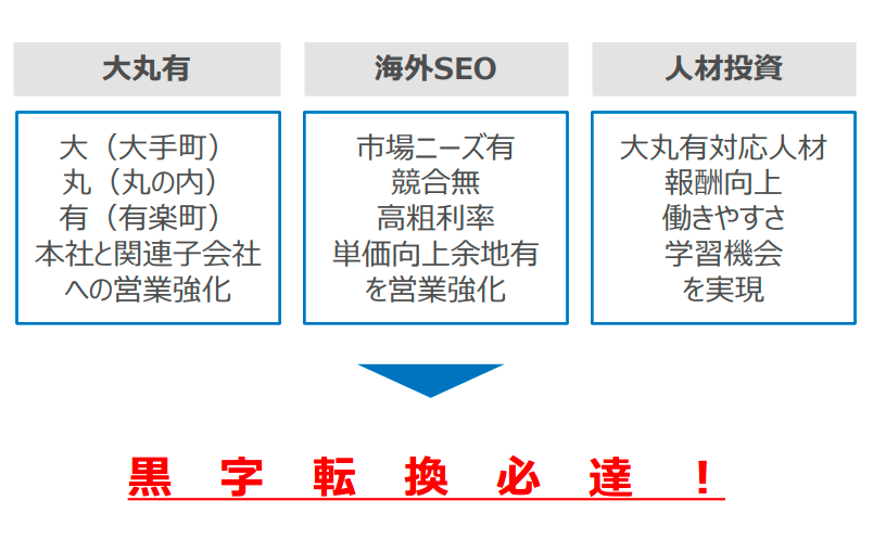 既存のサービスである海外SEO、および大(大手町)丸(丸の内)有(有楽町)エリアでの本社と関連子会社への営業強化に加えて、人材投資を積極的に行っていく方針です。