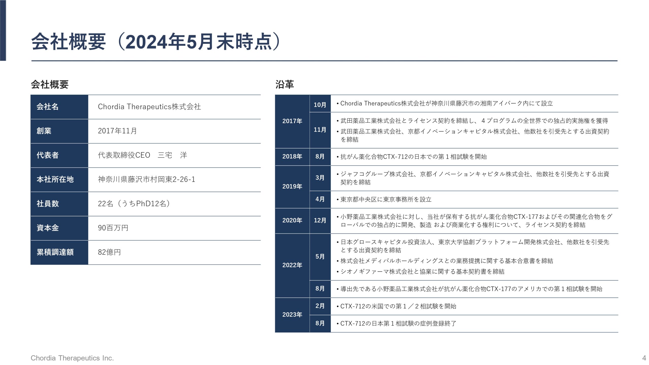 私たちChordia Therapeuticsは、日本最大手の製薬メーカーである武田薬品工業株式会社(以下、武田薬品)からスピンアウトする形で、2017年に創業いたしました。