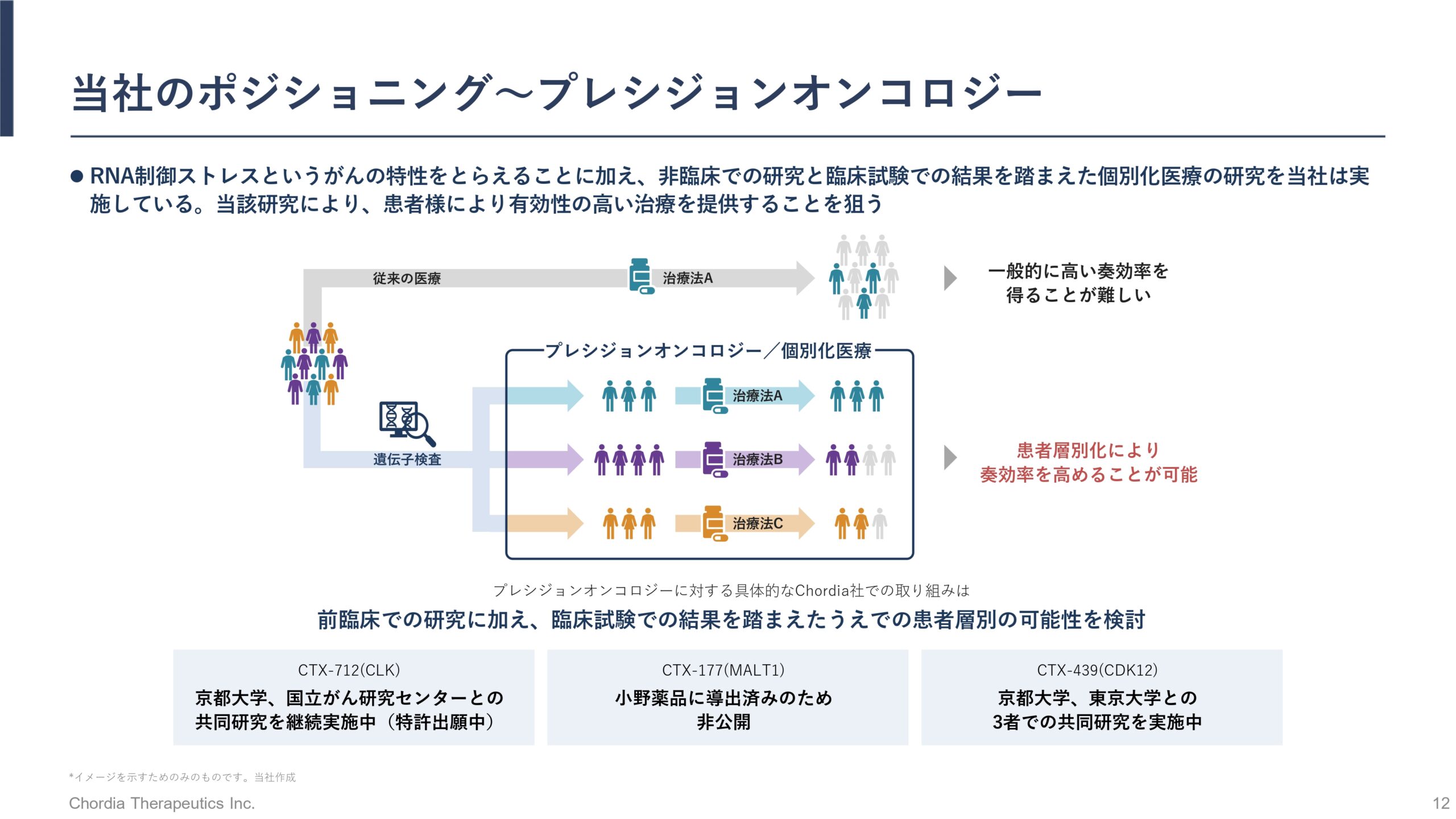 臨床試験においては患者様の同意を得た上で遺伝子検査を実施していることに加えて、前臨床の研究も行っており、すでにCTX-712では固形がんや卵巣がん患者様で有効性と結びつく可能性のある有望な遺伝子変化を見つけることができました。
