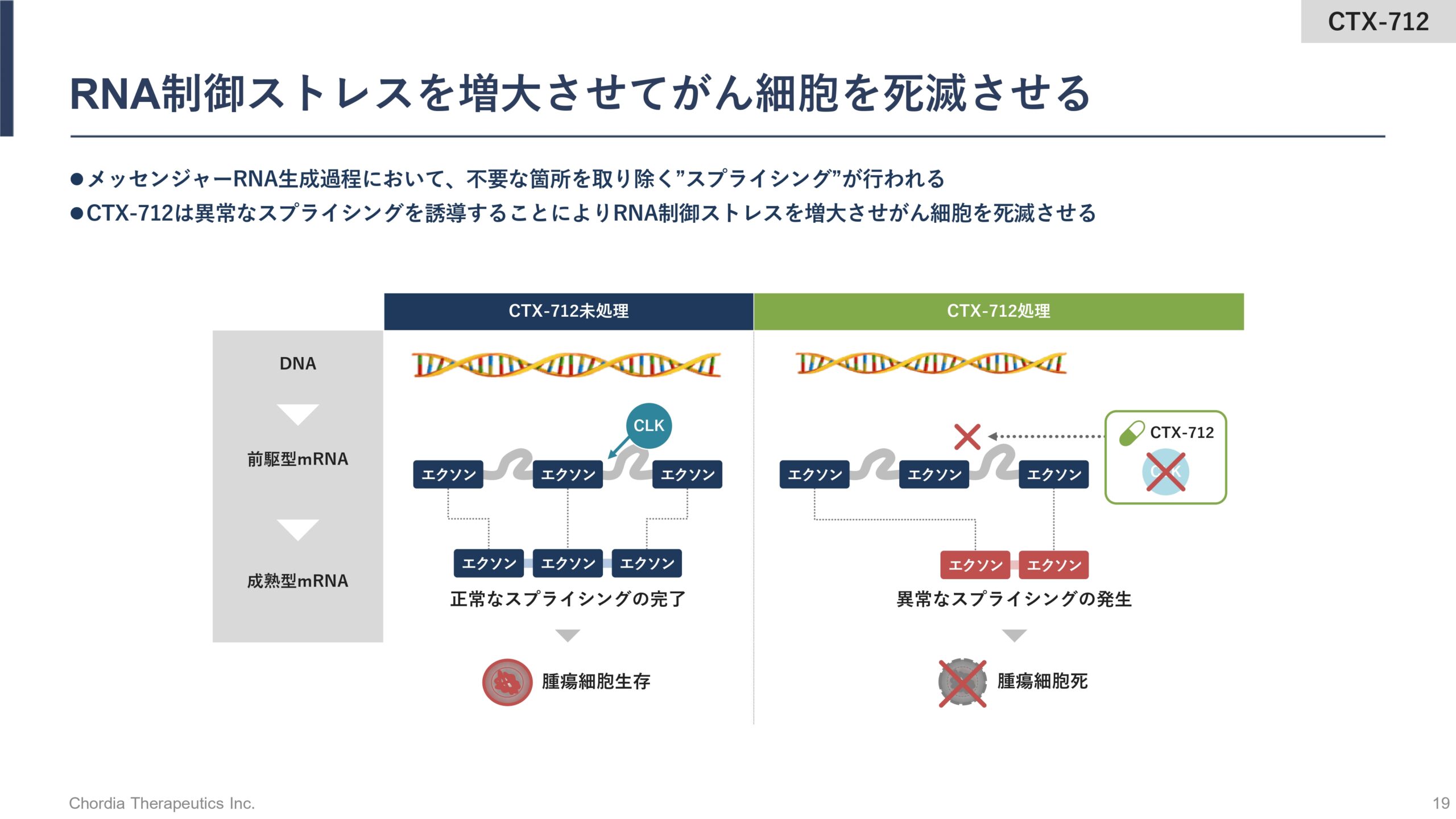 例えばCTX-712では、スプライシング反応を変化させることで異常なスプライシング産物を蓄積させ、追加のストレスを加えてがん細胞を選択的に死滅させることが可能です。