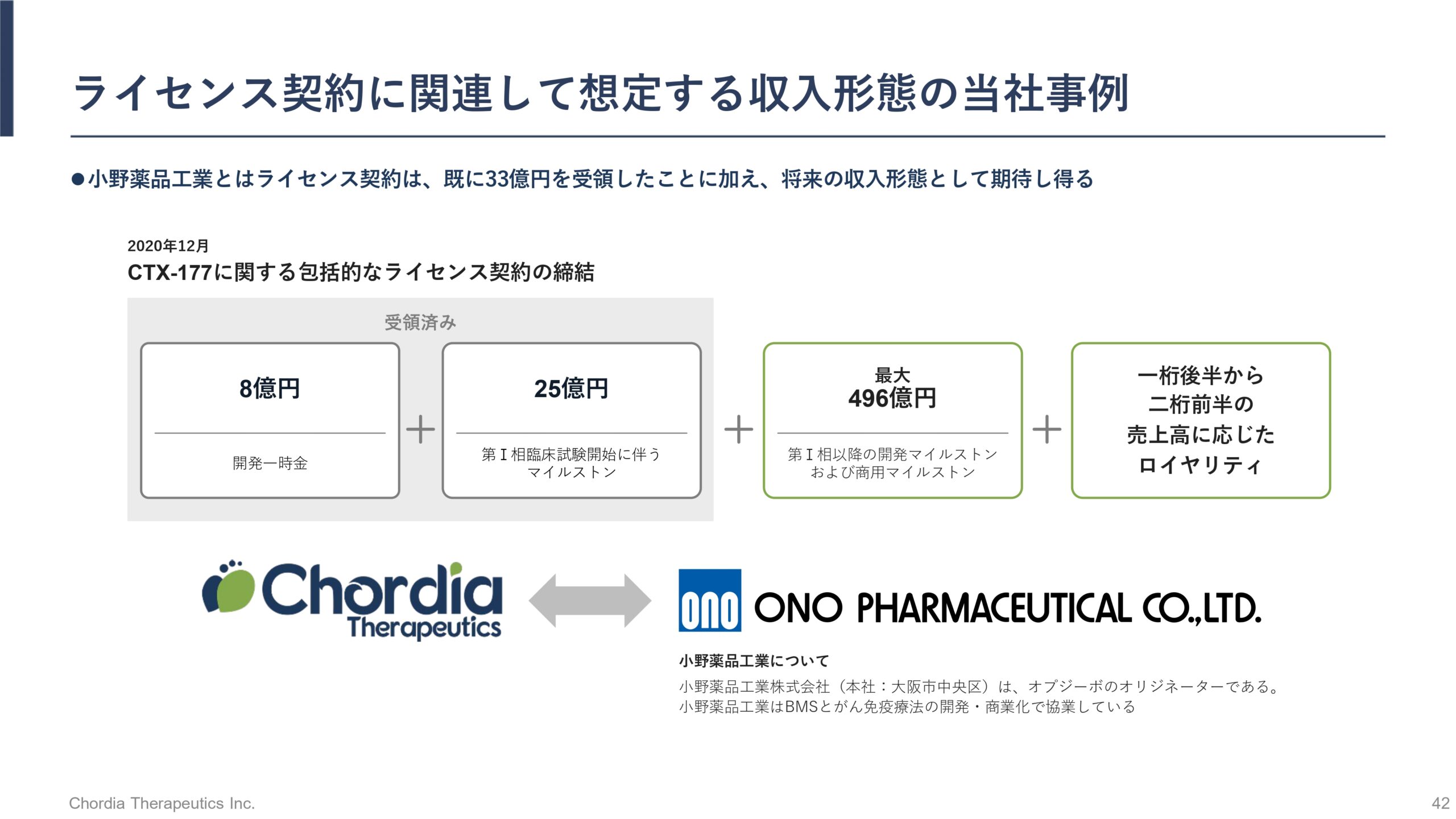 また、既にCTX-177では小野薬品への導出によるライセンス一時金や開発マイルストンを得ています。