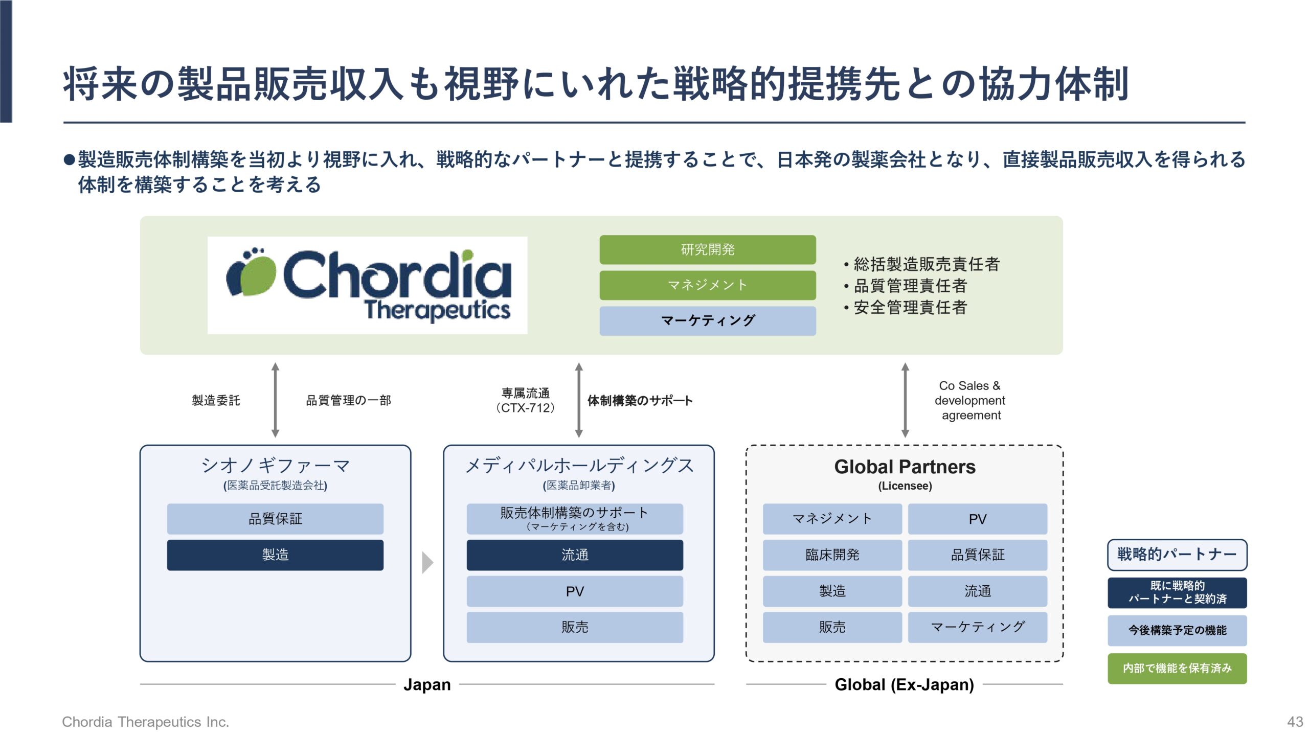 現在、製造はCDMOのシオノギファーマと、販売は日本最大手の医薬品流通卸であるメディパルホールディングスと連携しています。