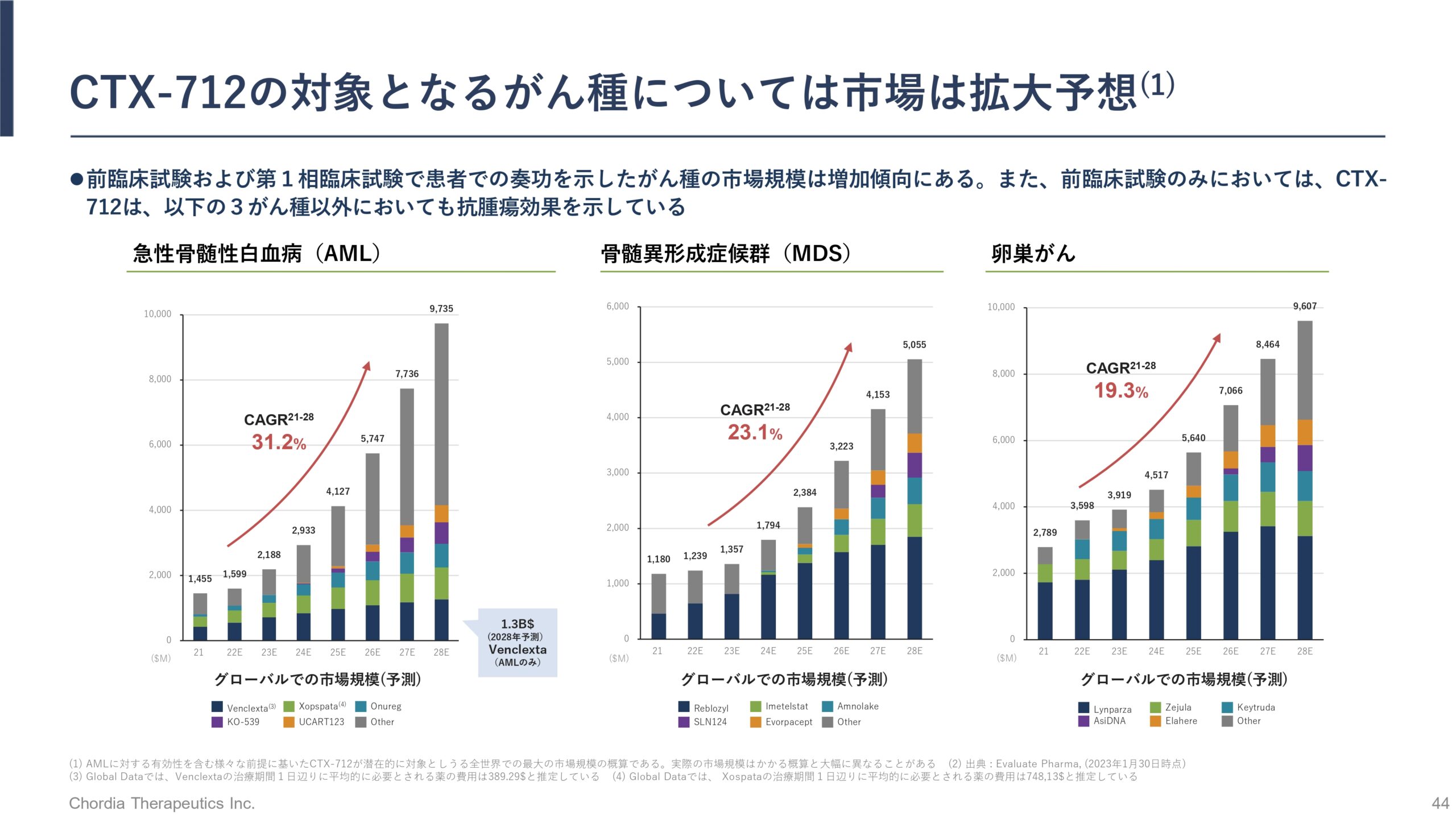 AMLに関しては、グローバル市場で約2,000億〜4,000億円の規模があり、その半分程度をCTX-712がカバーできれば、年商2,000億円も遠くはありません。